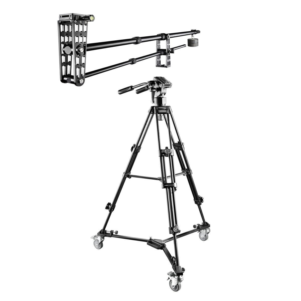 Camera crane Director Pro for professional tracking shots\nWith the high-quality aluminium camera crane Director Pro you can easily create jerk-free, vibration-free and swerve-free video shots with your DSLR, system camera or your camcorder. No matter whether near ground level tracking shots, quick changes in perspective or normal panning movements: the camera crane is quick and simple to operate and, in connection with a video tripod with panhead, the camera alignment remains flexible. This way you lift your video recordings to a professional level and have the opportunity to create exciting camera flights.\n\nA Video Tripod full of extremes: Extreme stable! Extreme flexible! Extreme sturdy!\nThe EI-9901 Video-Pro Tripod out of our first-class walimex pro series is something special. Smooth movements without jerking as well as the professional equipment make this possible. Soft panorama pannings over 360° and tilting movements from -85° to +90° are possible without problems. The panhead together with the two guide handles always provides a steady, smooth guiding. Besides, the head is equipped with a spirit level for perfect positioning.\nThe Tripod has two quick-release plates, which have a 1/4 inch connections. It is made of a sturdy aluminium alloy. The double-guided legs as well as the spider provide enough stability. Two removable guide handles, one built-in spirit level and rubber feets are certainly included as well as reliable quick-release fasteners. A carrying bag is also included in delivery.\n\nFlexible handling of crane and tripod\nWith its smoothly running wheels, these Dolly is especially suitable for the use in the studio. The sturdy construction provides high load capacity. The complicated moving of your tripod can be realized with this Tripod Dolly very quickly and precisely. It can be loaded up to 50kg. You can easily mount your tripod by seizing the knurled screw on the Dolly.