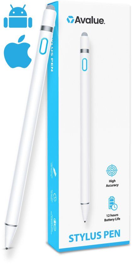 Avalue 2-in-1 Active Stylus Pen - White - Compatible with Tablet, iPad, Android & Apple Phones - Styluspennen
