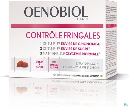 Oenobiol Snoepremmer is een voedingssupplement dat toelaat het snoepen te controleren. Oenobiol Snoepremmer werkt op 3 fronten: 1/ het vermindert de zin in suiker dankzij extract van Gymnema sylvestre, 2/ het geeft een verzadigingsgevoel dankzij johannesbroodpitmeel en 3/ het behoudt een normale bloedsuikerspiegel dankzij Chroom. Smaak: Mango-passievrucht