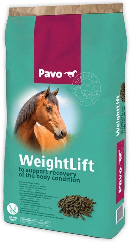 Pavo WeightLift is een ruwvoerproduct dat geschikt is voor schrale of magere paarden, die op een gezonde manier in gewicht mogen aankomen. Het bevat alle noodzakelijke bouwstenen die een paard nodig heeft voor een gezonde lichaamsconditie en spierontwikkeling, zoals essentiële aminozuren (eiwit) en omega 3 en 6. Daarnaast bevat het geen GMO, soja, bietenpulp of melasse. Pavo WeightLift ondersteunt een gezonde spijsvertering en is vanwege de graanvrije samenstelling en het lage suikergehalte bijzonder geschikt voor paarden met een graanintolerantie of stofwisselingsstoornis.