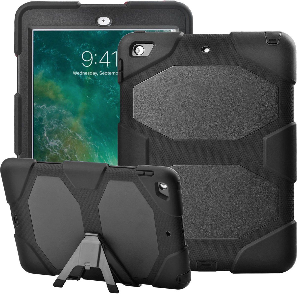 iCall iPad 9.7 2017 / 2018 - Volledige 360 Graden Bescherming Extreme Armor Hoesje met Screenprotector Siliconen Shockproof Zwart Hoesje met Versterkte Randen - Tablets