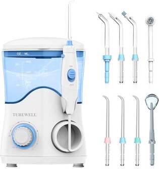 TUREWELL Elektrische monddouche, professionele monddouche met 10 instelbare waterdrukwaarden, 600 ml inhoud en 8 multifunctionele spuitmondpunten