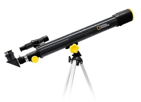 In samenwerking met National Geographic heeft Bresser een zeer aantrekkelijk serie instrumenten uitgebracht waaronder deze lenzentelescoop met een lensopening van 50mm en een brandpunt van 600mm. Deze National Geographic 50/600mm telescoop is perfect voor de beginner die op zoek is naar een prima instrument om de wonderen van heelal te verkennen. Met een paar eenvoudige stappen is deze telescoop klaar voor gebruik en u ontdekt de wereld van de maan en planeten. Een kleine zoeker maakt het vinden van objecten een stuk eenvoudiger en de drie verschillende oculairen zorgen voor verschillende vergrotingen. De werking van de telescoop is eenvoudig: de telescoop kan men eenvoudig van richting veranderen door de centrale fixatieknop iets los te draaien. Het focussysteem aan het einde van de telescoop wordt gebruikt om het hemellichaam scherp te stellen. Door de in hoogte verstelbare statief kan de telescoop worden ingesteld op de juiste hoogte voor kleine of grote sterrenkijkers. De meegeleverde zenitspiegel zorgt voor comfortabel kijken.\n\n- beginner telescope and accessories\n- tripod height individually adjustable\n- also suitable for observations of the landscape