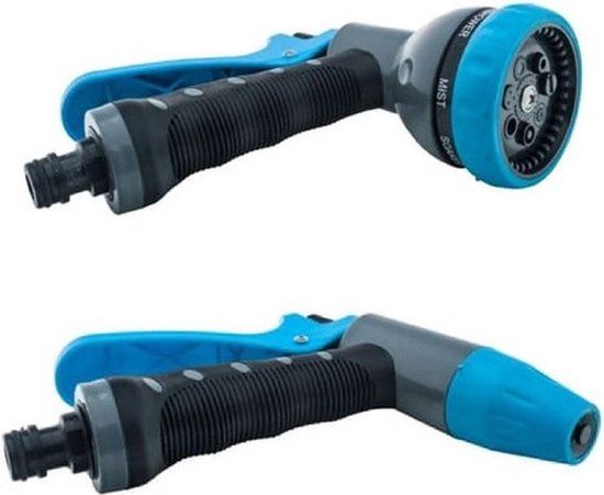 Een set met 2 anti-slip tuinslang sproeipistolen/spuitpistolen/sproeikoppen. De set bevat een sproeikop met straalsysteem met Jet-instensiteitsinstelling en een spuitpistool met zeven verschillende functies waaronder nevel. Kleur: blauw/grijs. Materiaa