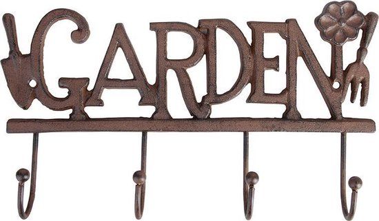 4 Haken aan een decoratieve gietijzeren wandplaat met tekst "Garden" en vorkje, schepje en bloempje. Antiek roestbruin.