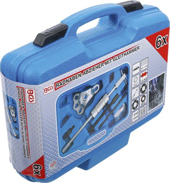gesmede uitvoering voor het uittrekken van wielnaven de schroefdraadmaat van de binnenschroefdraad op de slaghamer is 9/16" x 12G de opname van de trekkervoet is 5/8" x 18G Totale lengte met gemonteerde trekkervoet ca. 510 mm de verschillende schroefdraden kunnen onderling worden aangepast door middel van een meegeleverde adapter Slaghamergewicht 1600 g, Gewicht: 9.1932763254 ponden, Fabrikant: BGS technic