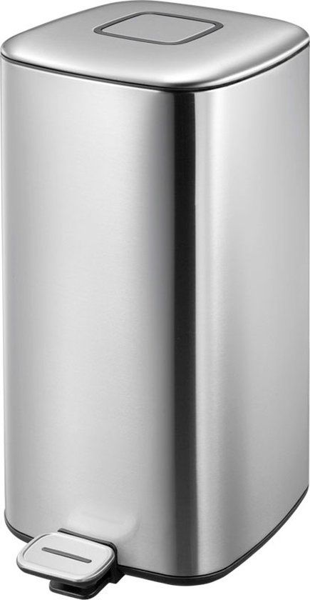 Vierkante pedaalemmer van geborsteld RVS met fingerprint proof coating. Voorzien van kunststof binnenemmer, handgreep aan de achterzijde en geruisloos sluitend deksel met opvallend design.