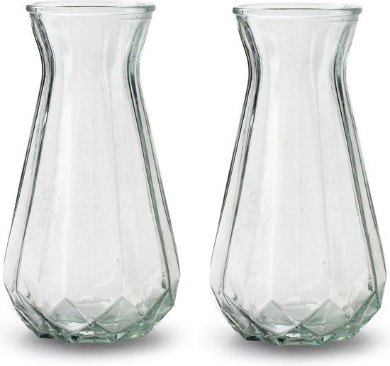 2x Stuks Bloemenvazen gemaakt van helder/transparant glas. Stijlvol model. Afmetingen: H24 cm en D13.5 cm. Geschikt voor bloemen, decoratie takken en boeketten. Voor binnen gebruik. Voordelen van dit artikel Bloemenvaas voor binne