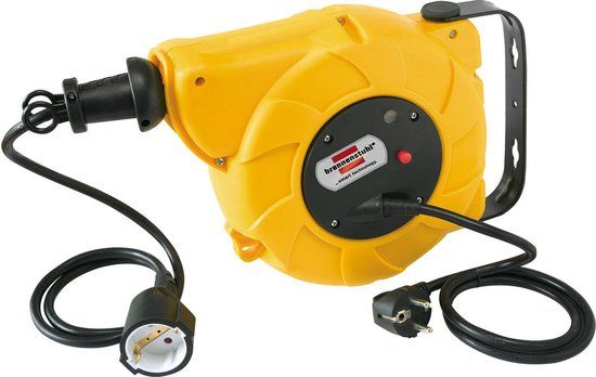 Automatic cable reel IP20 9+2m H05VV-F 3G1,5\n- Convenient automatic rewind.\n- For fitting on walls and ceilings.\n- Slewable up to 180°.\n- Robust plastic housing.\n- With safety cut-out.\n- Childproof socket.\n- In colourful display-packaging.\n- Cable length: 9 + 2 m\n- Cable: H05VV-F 3G1,5\n- Cable quality: Kunststoff\n- Cable colour: Black\n- Plug-in system: DE