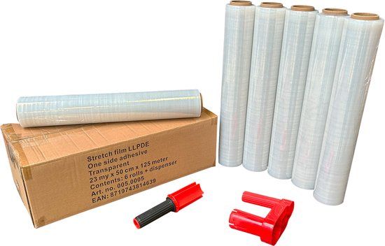 Transparant stretchfolie 23my x 50cm x 125meter. + handige kunststof folie dispenser