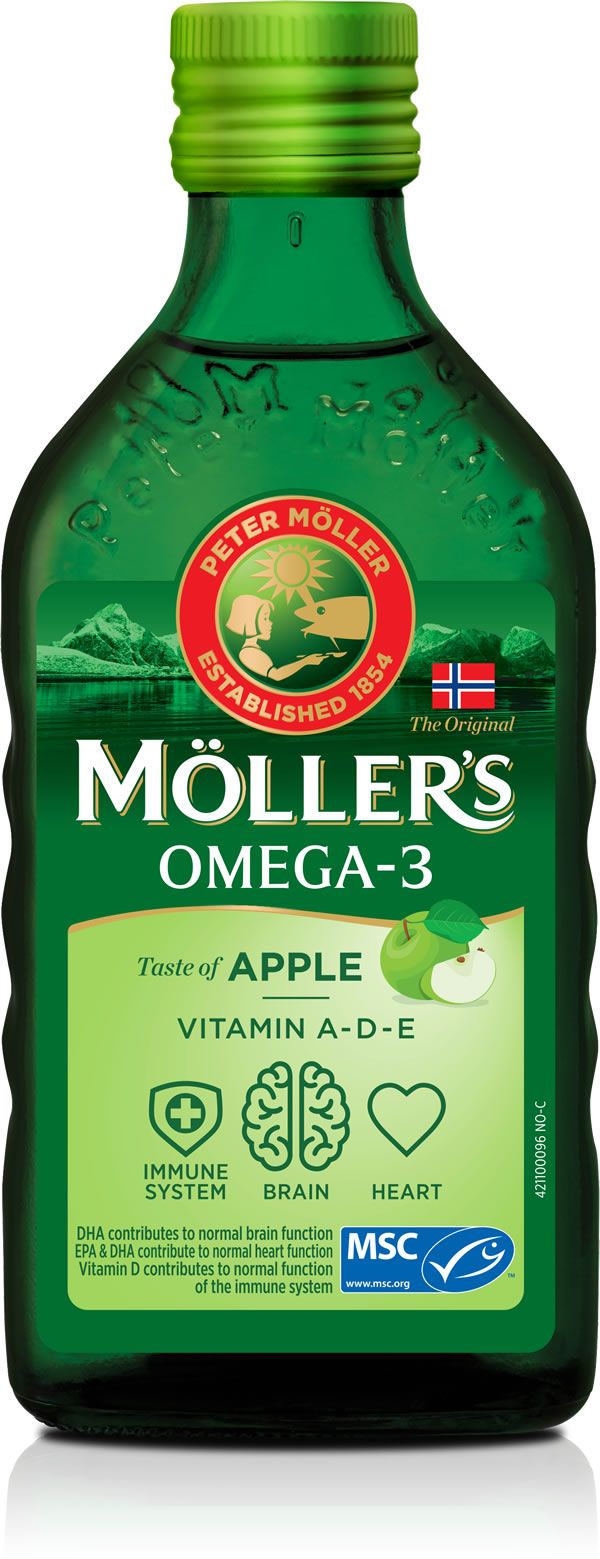 Mollers Omega-3 Appel Levertraan is een pure omega-3 dat vitamine A, D en E bevat en dat gemakkelijk in te nemen is door de aangename lichtzoete appelsmaak. Deze visolie bevat bijzonder veel gezonde vetzuren en komt van wilde Arctische kabeljauw die op duurzame manier gevangen is in Noorwegen en zich daardoor MSC-gecertificeerd mag noemen. Mollers Omega-3 Appel Levertraan:- zuivere levertraan met zachte appelsmaak- compleet met vitamine A, D3 en E- verse visolie met zeer lage oxidatiewaarde, geeft daardoor geen oprispingen- met natuurlijke triglyceridevorm waardoor het beter door het lichaam wordt opgenomen- vloeibaar, waardoor gemakkelijk in te nemen- duurzaam en MSC-gecertificeerd- zonder kunstmatige kleur- of smaakstoffen- zonder suikers of zoetstoffenDoseringVoor kinderen vanaf 3 jaar en volwassenen: 5ml (1 dessertlepel) per dag. Het is belangrijk om u te houden aan de aanbevolen dagelijkse inname of adviezen van uw arts. Ook voor zwangere vrouwen en vrouwen die borstvoeding geven.Tevens te verkrijgen in de smaken Citroen, Tutti Frutti, Naturel, en in capsulevorm.