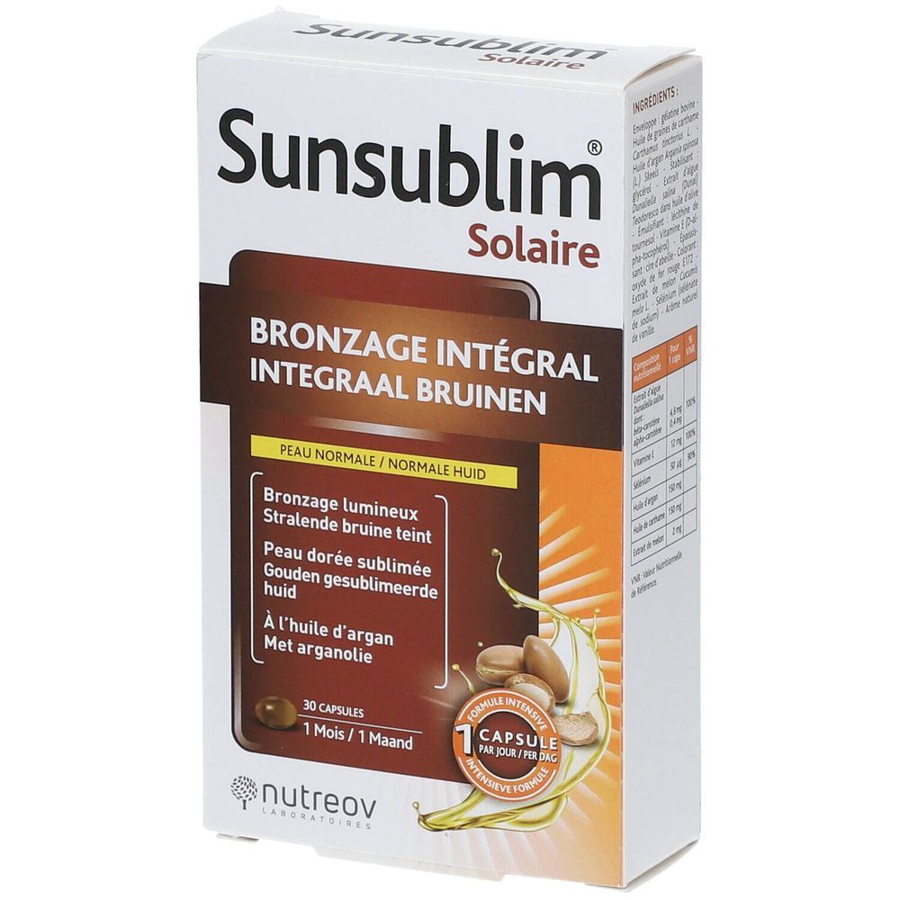 Nutreov Sunsublim Integraal Bruinen voor een stralende bruine kleur en een subliem ogende huid. (30 Cosmxpert; Nutreov) Sunsublim® Solaire Integraal Bruinen, de vrucht van onderzoek door de laboratoria Nutreov, is een zonvoorbereider van de nieuwe generatie die een stralende bruine kleur geeft, dankzij een innoverende oplossing geïnspireerd op de natuur.Wil je graag mooi bruin worden? Dan moet je je huid voorbereiden. Bruinen is een mechanisme waarmee het organisme zich beschermt tegen de zon, door onder andere melanine aan te maken, een pigment dat als functie heeft om zonnestralen te absorberen, maar dat ook een esthetisch effect geeft! Sunsublim® Solaire Integraal Bruinen, het resultaat van onderzoek door de laboratoria Nutreov en geïnspireerd op de natuur, is een zonvoorbereider van de nieuwe generatie die zorgt voor een stralend bruin kleurtje én bovendien de huid beschermt. Een drievoudige werking: diepe bruining, gevoede huid en bescherming tegen veroudering.Verdeler:Nutreov Phytea5 Avenue Louis Blériot63000 Clermont-FerrandFrankrijkNettogewicht:39,7g