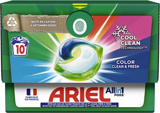 Ariel All-In-One pods original voor een stralende witte was. De inhoud bestaat uit 10 pods die goed zijn voor 10 (koude) wasbeurten.
