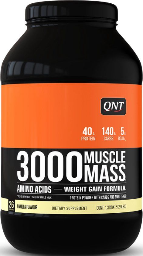 3000 Muscle Mass van Qnt is de ideale metgezel voor uw training met als doel uw spiermassa te behouden of op te bouwen. Het poeder biedt u niet alleen een rijke concentratie weiproteïnen, maar ook aminozuren en een uitstekend vitamine- en koolhydratencomplex. Zo ondersteunen de wei-eiwitten en aminozuren het onderhoud en de groei van de spieren en zorgen ze voor een beter herstel na de training. Het poeder is verkrijgbaar in vier verschillende smaken: banaan, chocolade, aardbei en vanille. Er zitten in totaal 26 porties van 50g per stuk in de verpakking van 1,3kg.
