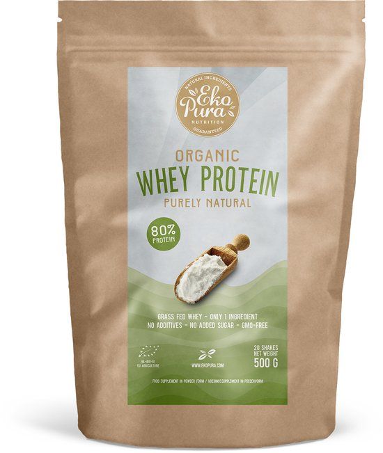 Ekopura Organic Whey Protein bevat 80% eiwit en is volledig biologisch (Skal) gecertificeerd. De gangbare whey proteïnes op de markt maken veelal gebruik van kunstmatige toevoegingen, smaakstoffen en kleurstoffen. Ekopura kiest er echter voor om eerlijke, schone en pure eiwit producten aan te bieden. De whey proteïne is natuurlijk, bevordert het immuunsysteem, bevat alle essentiële aminozuren en zit boordevol antioxidanten. Ekopura whey voldoet aan de strenge Europese richtlijnen die gelden voor biologische voeding.
