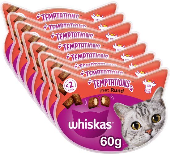 Whiskas temptations is een heerlijk verwenmomentje voor uw kat. De krokante snoepjes met een zachte vulling van rund zorgen zorgen voor een tevreden kat.