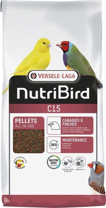 In de natuur zoeken vogels naar de voedingsstoffen die ze op dat moment nodig hebben. In gevangenschap ben jij degene die jouw vogel voorziet van de juiste voedingsstoffen, daarom is de juiste voeding héél belangrijk! C15 Kanarie onderhoudsvoer van Versele-Laga Nutribird is een volledig vogelvoer. Deze pellets bevatten alle noodzakelijke voedingsstoffen voor een evenwichtige gezonde voeding en voorkomt selectief eetgedrag. De pellets bevatten natuurlijke kleimaterialen en prebiotica voor een gezonde darmflora en optimale vertering. Daarnaast bevat het de optimale calcium-fosforverhouding voor een gezond skelet. Ook zal het verenpak prachtig stralen door alle aanwezige voedingsstoffen!