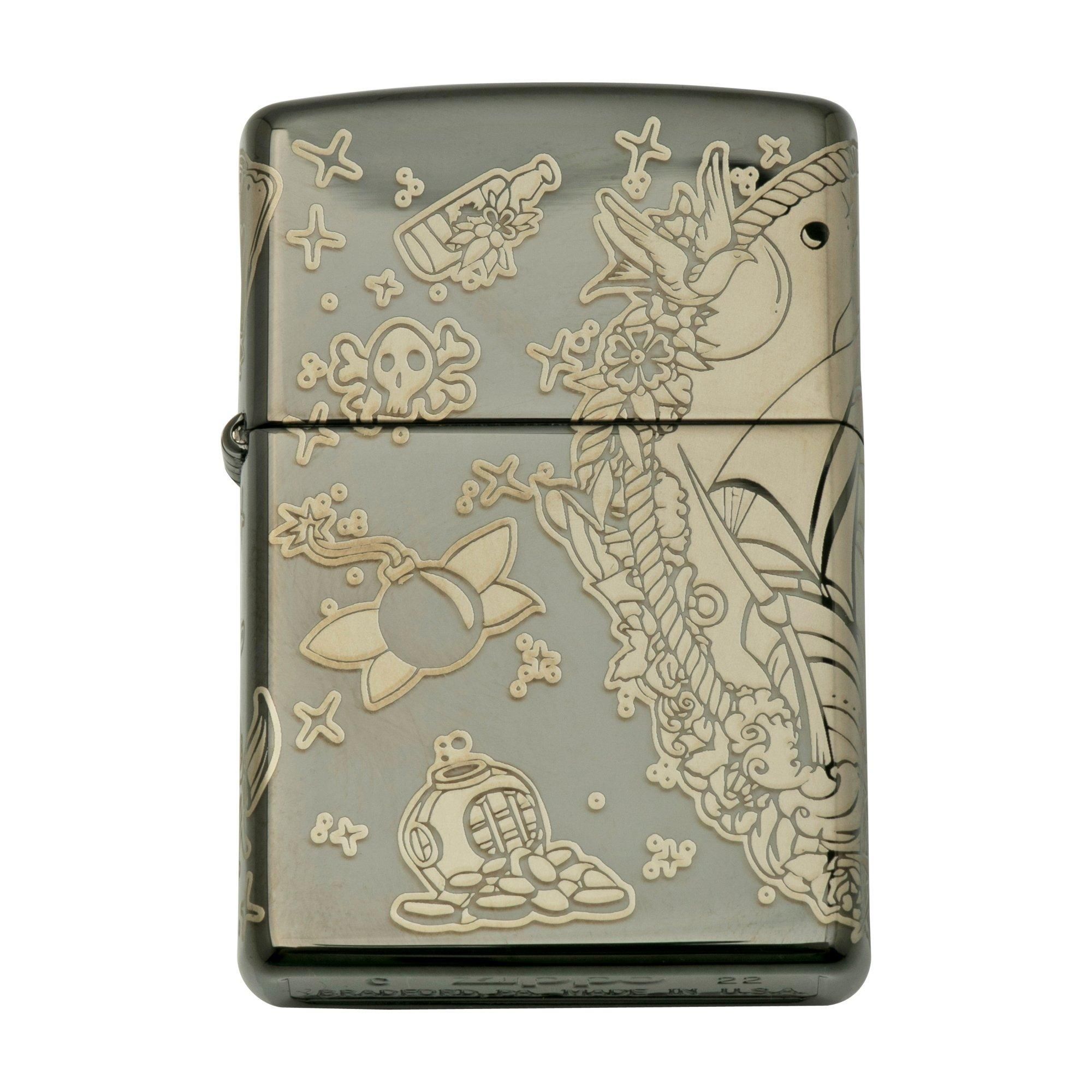 Deze Zippo aansteker is versierd met een tattoo design met piratenthema. Het zwart is glanzend zwart.