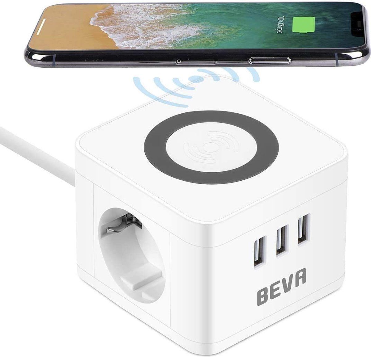 BEVA Cube Stekkerdoos - 2 vakken + 3 USB met draadloze laadfunctie - Wit