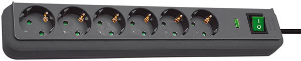 6-delige geaarde stekkerdoos met overspanningsbeveiliging met 1,5 m kabellengte en geïntegreerde kinderbeveiliging\n- Verdeeldoos met verlichte veiligheidsschakelaar voor in- en uitschakelen (tweepolig) en functiecontrolelampje\n- Beschermt waardevolle apparaten tegen overspanning met een maximale lekstroom tot 13.500 A (bescherming bij onweer, blikseminslag, enz.)\n- Stopcontacten met randaarde in 45° geplaatst, ook voor haakse stekkers\n- Inhoud: 1 x Eco-Line stekkerdoos met overspanningsbeveiliging in de kleur antraciet – in de beste kwaliteit van Brennenstuhl