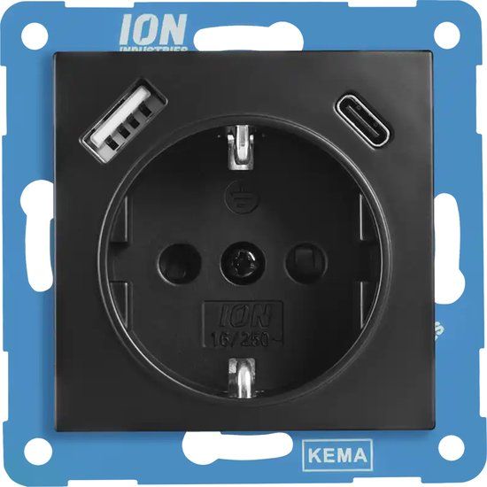 ION Industries Stopcontact met Randaarde, USB A & USB C - Mat Zwart - Wandcontacten