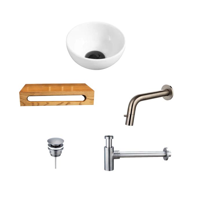 Bekijk productKeramische Waskom Wit Rond 40x22x8 cm met Massief Houten Planchet, Inbouwkraan, Afvoer en Sifon Gun Metal - Wandgemonteerde toiletten