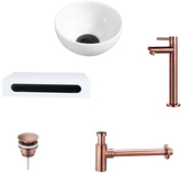 Zwarte Ronde Keramische Wastafel met Houten Plank, Bronzen Kraan, Afvoer & Sifon - 40x22x8 cm