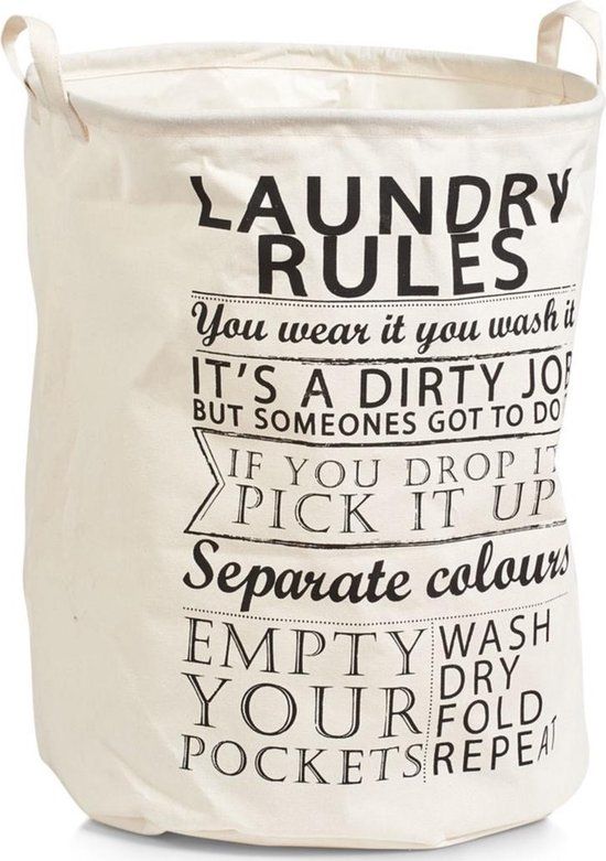 Een grote ronde cremekleurige wasmand/wasgoedmand. De wasmand heeft aan 2 zijdes een handvat voor makkelijk dragen. Op de mand staan Engelstalige teksten m.b.t. was regels. Afmeting: ca. D38 x H48 cm. Materiaal: katoen. Inhoud: ca. 69 liter. Reinigen: