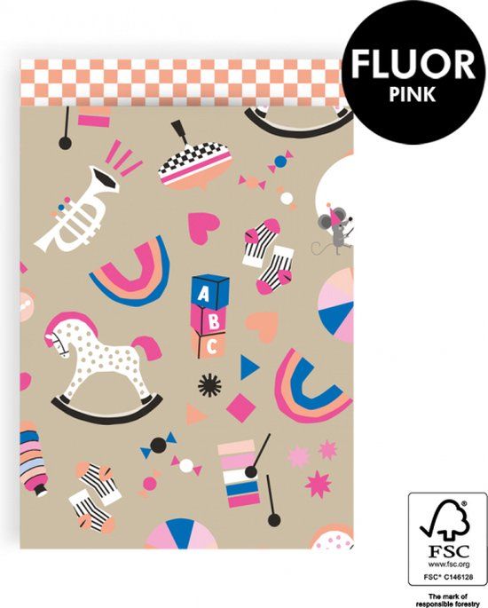 Maak het inpakken van cadeaus voor kinderen extra leuk met ons speelse inpakzakje. Het dessin toont een verscheidenheid aan speelgoed en een schattig muisje dat op een trommel speelt. De binnenkant van het zakje heeft een vrolijk ruitjespatroon. Dit zakje is perfect voor het inpakken van kindercadeaus en zal de verbeelding van de ontvanger zeker prikkelen.