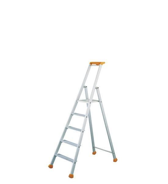 Professionele industrietrap met groot bordes. De kokerprofielen zorgen voor een robuuste constructie die toch handzaam en makkelijk mee te nemen is. Doordat deze profielen geanodiseerd zijn houdt u schone handen tijdens uw werkzaamheden. De trap is voorzien van 9 cm diepe treden welke door het kokerprofiel heen zijn gefelst. Het aluminium scharniergewricht is gemonteerd in een polyiamide behuizing in het achterraam. De trap is voorzien van grote, 50 mm, anti-slip voeten en een handige materiaalbak in een opvallende oranje kleur. Deze bak is ideaal voor handgereedschappen of andere materialen mede dankzij een afsluitbaar vak voor kleine onderdelen.