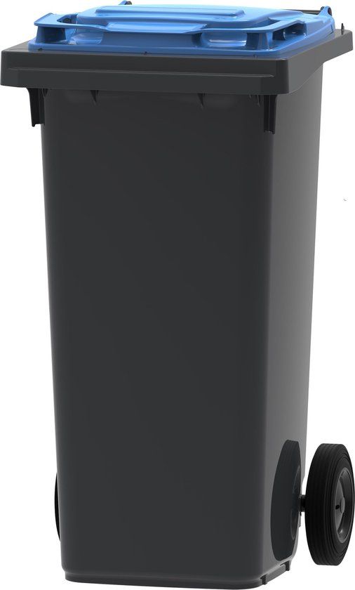 • Donker grijze afvalbak met blauwe deksel met een inhoud van 120 liter;