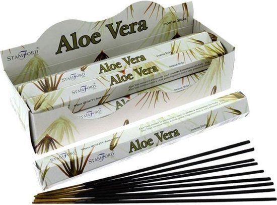 Wierook stokjes aloe vera, 3 pakjes. Inhoud: 3 pakjes met wierook stokjes. Totaal: 60 stuks. De stokjes zijn ongeveer 25 cm lang. Geur: aloe vera.