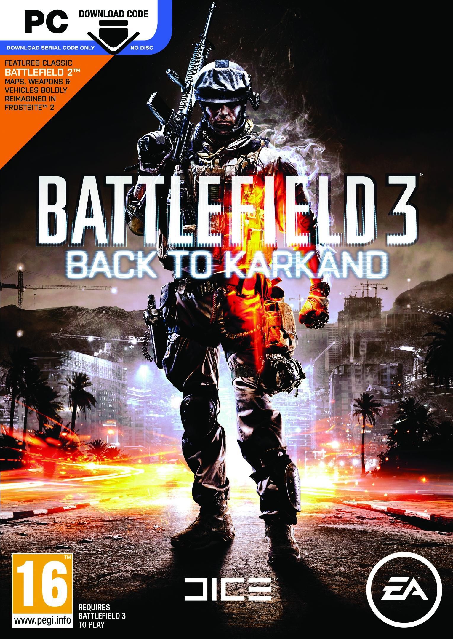 Four Re-imagined Battlefield Maps\nBack to Karkand features four of the most beloved Battlefield 2 maps (Strike at Karkand, Gulf of Oman, Wake Island and Sharqi Peninsula), all fully re-imagined utilizing the power of the Frostbite 2 engine.\n\nMore Weapons, More Vehicles\nEnhance the signature Battlefield "Rock, Paper, Scissor" gameplay with an arsenal of ten new weapons that you can bring back to the base game and three new vehicles including the STOVL fighter jet, desert buggy, and an APC.\n\nEnhanced Destruction\nFrostbite 2 creates a whole new level of life-like destruction. The enhanced destruction in this expansion pack lets you turn entire maps into rubble. Chip away at cover, blow holes in walls, and bring down building façades on enemies.\n\nConquest Assault\nBack to Karkand marks the return of the classic Conquest Assault mode from Battlefield 2. A slight twist on the beloved Conquest mode, Conquest Assault starts with one team commanding all flags on the map while the opposing team must assault and take the flags over in order to stop their tickets from bleeding down to zero.\n\nEnhanced Persistence\nWith the introduction of the all-new Assignments, Back to Karkand features an added layer of persistence on top of what is in the base game. With a vast range of unlockables and upgrades, the combined persistence in Battlefield 3 and Back to Karkand will keep players occupied even longer.\n\nPersonalized Dog Tags\nPlayers can express their individuality with five new dog tags including Dolphin Diving and One Man Army. Players can pick the design that showcases their play style best and show it off on the battlefield.