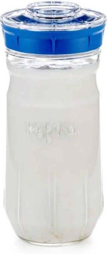 - Transparante afdichtdeksel:om het ontsnappen van overtollig kooldioxide te vergemakkelijken en overdruk te voorkomen, kan de transparante afdichtende afdekking van het glas zodanig worden geplaatst dat het goed en veilig sluit, maar niet volledig luchtdicht. De afdichtdeksel is voorzien van een praktische doseerinrichting voor de melkkefirknollen of waterkefirkristallen.