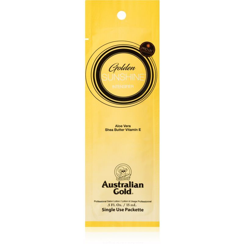 Australian Gold Gold Sunshine, 15 ml, Producten voor het zonnebaden voor Vrouwen , Wil je stralen met een prachtig gebruind lichaam, maar heb je geen zin om te wachten tot de zon sterker wordt of tot je op vakantie kunt naar warmere oorden? Met de zelfbruiner Australian Gold Gold Sunshine geef je je lichaam een onberispelijk, gelijkmatig en natuurlijk ogend kleurtje, waar en wanneer dan ook, het hele jaar rond. Je zult er snel en makkelijk prachtig bruin van worden, alsof je van het strand kwam, maar dan zonder dat je je huid aan de zon hoeft bloot te stellen. Kenmerken: hydrateert en voedt heeft een langdurig effect zorgt voor het effect van een intensieve bruining Hoe te gebruiken: Breng een voldoende hoeveelheid van het product aan op de huid van het hele lichaam. Grondig en gelijkmatig uitwrijven. Was na het aanbrengen je handen grondig.