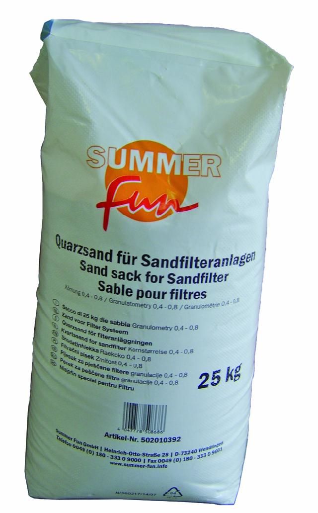 Filterzand voor alle zandfilters. De korrelgrootte is 0,4 - 0,8 mm. Standaard advies om het vat voor ongeveer 75% te vullen, maar raadpleeg de instructies bij uw filter voor de juiste hoeveelheid. Gemiddeld wordt het zand voor de filters om de 2 jaar vervangen. Wordt geleverd in zakken van 25 kg.