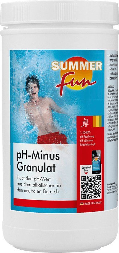 Summer Fun PH- (min) 1,5 kg is een middel om de pH-waarde van het zwembadwater te verlagen. De pH-waarde is belangrijk voor een optimale werking van de chloorproducten en dient tussen 7,2 en 7,6 te worden gehandhaafd. Nooit mengen met andere (zwembad)chemicaliën, altijd het product aan water toevoegen, nooit andersom. Bijzondere gevaren: bijtend. Verpakking 1,5 kg.\n\n- PH waarde verlagend\n- Ideale waarde: tussen 7,2 en 7,6\n- Eerst oplossen water, dan toevoegen aan zwembad