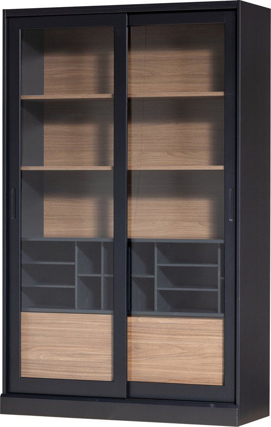 De James vitrinekast is een eigen productie van het Nederlandse merk WOOOD. De vitrine James heeft een prachtige landelijke stijl met een stoere uitstraling en is gemaakt van hout. De matzwarte delen zijn gemaakt van grenen en de houtkleurige delen zijn gemaakt van spaanplaat met notenprint. De James vitrine is in een zwarte kleur geschilderd. Het interieur van de kast heeft de natuurlijke kleur van het hout. De ruimte tussen de planken is 33,3 cm. In deze kast kunt u veel opbergen door de 3 planken en de kleinere zwarte planken. Laat uw favoriete servies of glaswerk zien en stijl het met prachtige accessoires. Het glas in de deuren heeft een dikte van 4 mm.