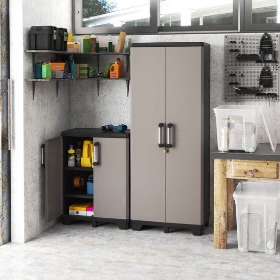 Deze Pro opbergkast van Keter heeft een strak modern minimalistisch uiterlijk, met een zwarte en grijze structuur, 4 verstelbare planken en een metalen stang in de plank. Deze kast is eenvoudig te onderhouden en zeer veilig dankzij de afsluitbare deuren.